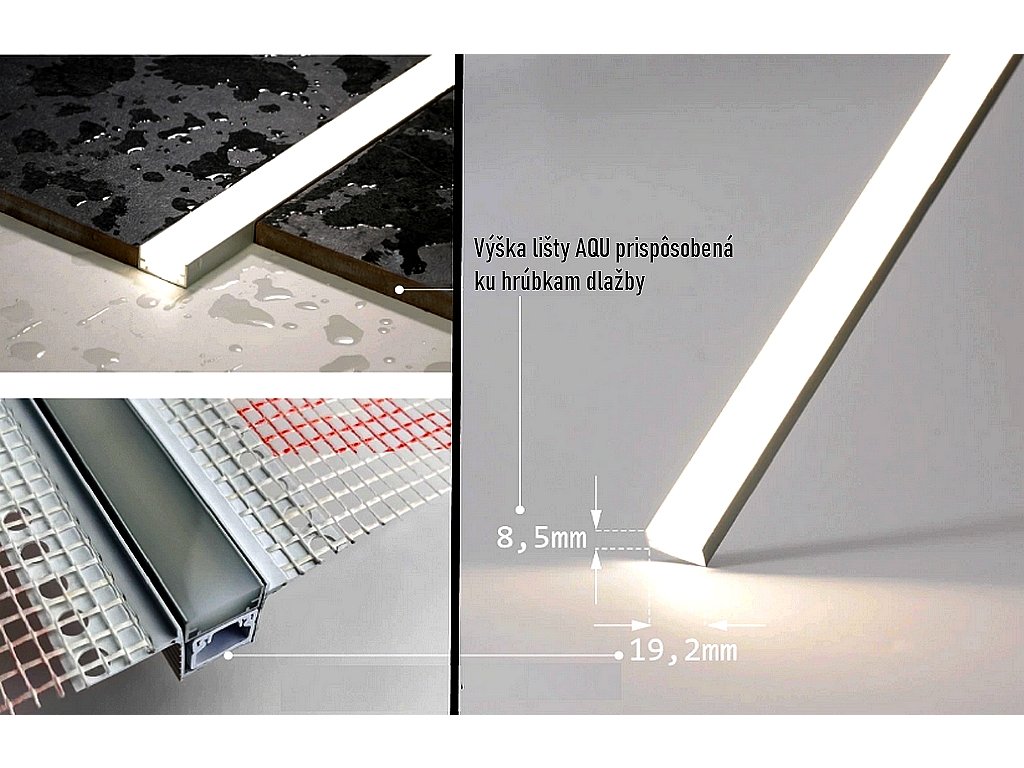 Náhrada celého „setu pásik + profil + klapka + silikón“ – AQU je jeden kompletný prvok, ktorý plne nahrádza skladanie profilu, LED pásika, krytu, záslepiek a silikónového tesnenia, čo skracuje montážny čas aj riziko chýb.