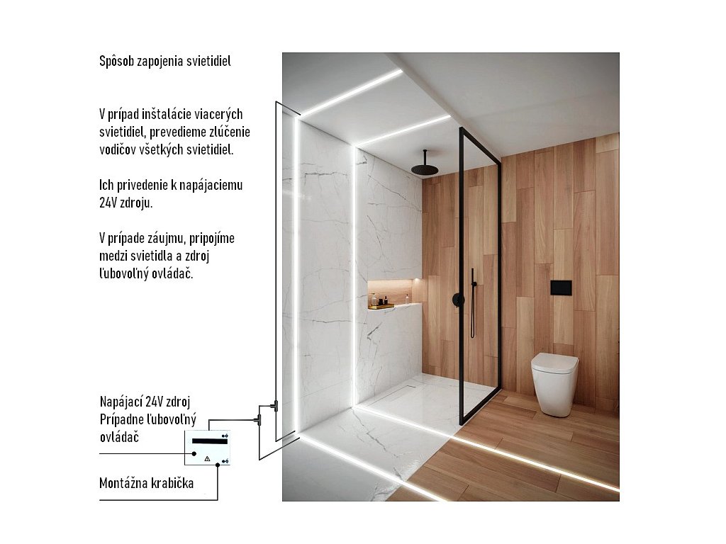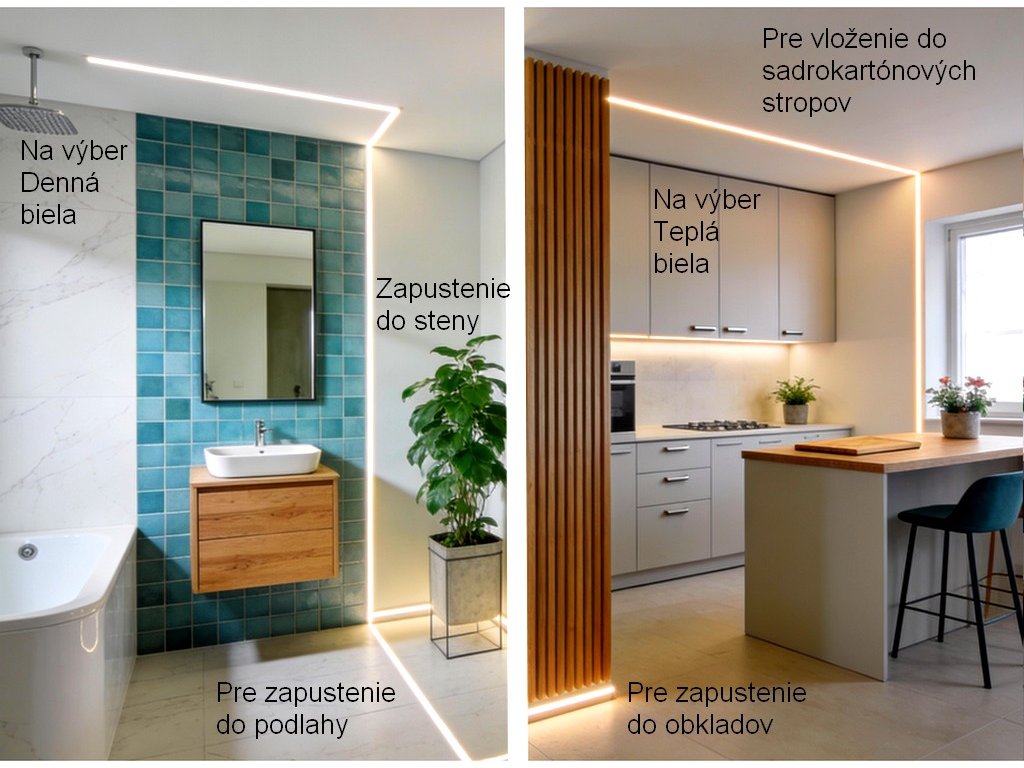 Pri návrhu osvetlenia odporúčame voliť dĺžku svietidla tak, aby línia svetla presne kopírovala šírku sprchového kúta, vane, schodu alebo fasádneho prvku – vďaka možnosti rezu po 1 mm dosiahnete bezchybné lícovanie bez viditeľných medzier či prechodov. Svietidlá napájajte bezpečným napätím 24 V DC z kvalitných zdrojov a pri väčších projektoch využite kompatibilné LED ovládače alebo Smart Home systémy na stmievanie, časové scény a komfortné ovládanie osvetlenia v interiéri aj exteriéri.