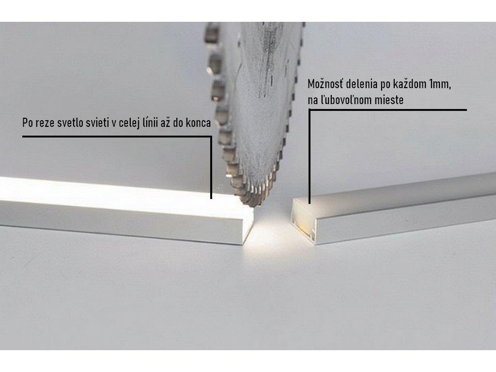Rezanie na mieru po 1 mm bez straty svietivosti, bez straty záruky a vždy ostáva s krytím IP68 – zákazník vie presne doladiť dĺžku (výklenok, medzera medzi dlažbou a pod.) bez viditeľných spojov, svetelná línia zostáva súvislá.
