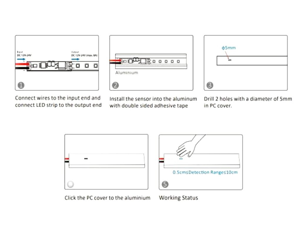 Senzor umiestni pod plastovú krytku (v závislosti od priehľadnosti krytu môže byť potrebný otvor nad senzorom) AL profilu tak, aby vzdialenosť k ruke pri bežnom používaní bola do 5–10 cm a nad profilom neboli prekážky, ktoré by spúšťali senzor nechcene.