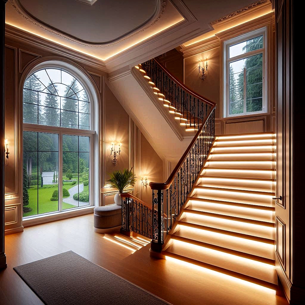 Inšpirácia pre extravagantné osvetlenie z LED pásov 230V kreatívne umiestnených v elegantných krivkách na stene v extravagantnom e...