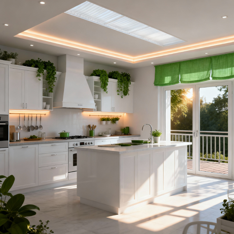Pri nasvieteni pracovnej dosky kuchynskej linky je vhodná farba krytu pre dobrý rozptyl svetle, nepohlcuje svetlo a vytvára plynulé svetlo