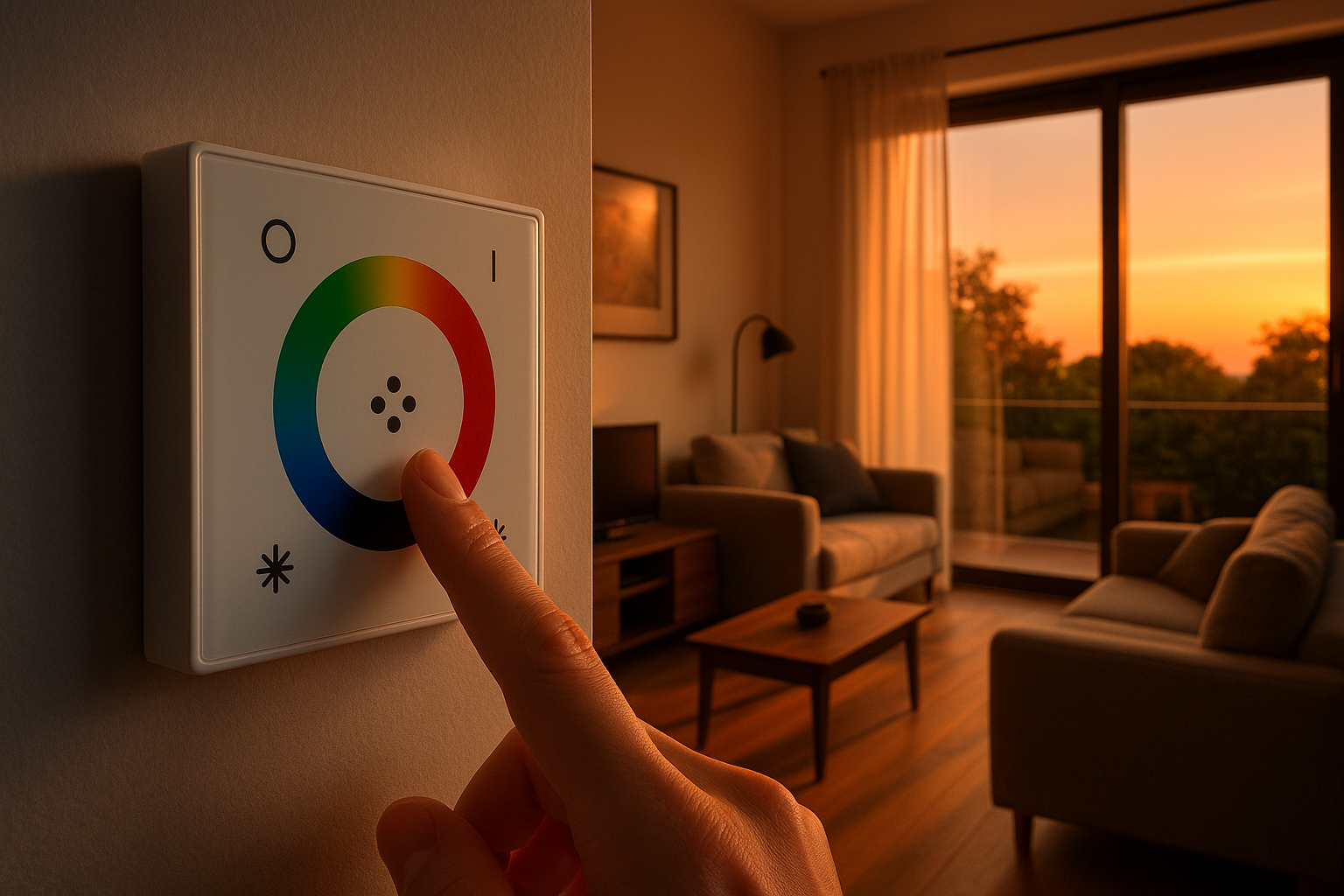 RGB LED pásik pod kuchynskou linkou, ovládaný dotykom priamo zo steny.