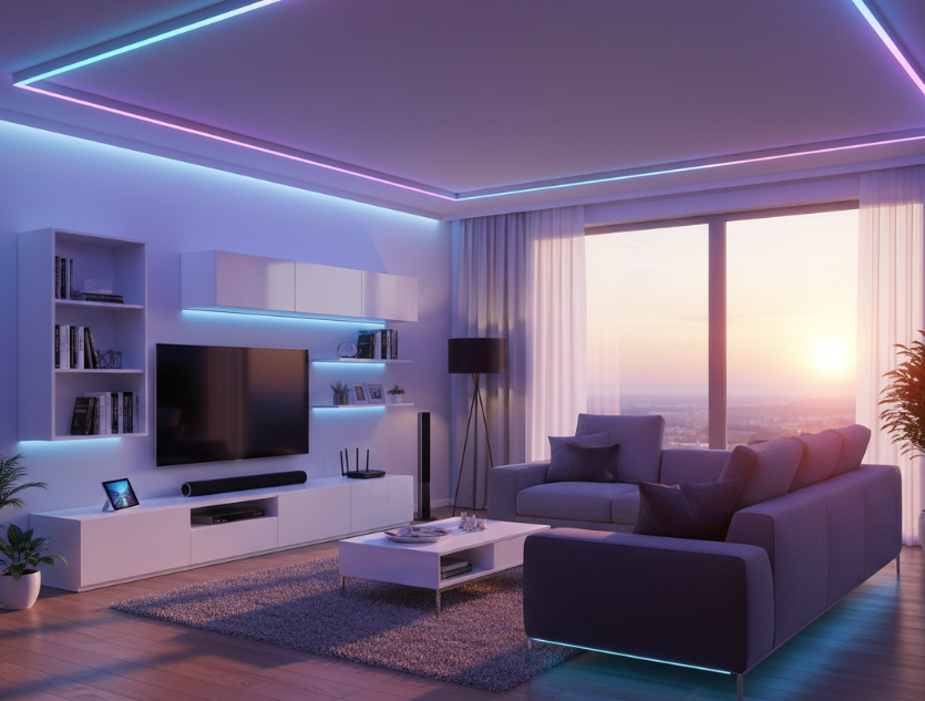 Farebné dekoratívne osvetlenie v interiéroch s prihliadnutím na silné jasné farby so samostatnou Bielou farbou svetla, široké uplatnenie, napríklad v podhľadoch pri znížených stropoch :