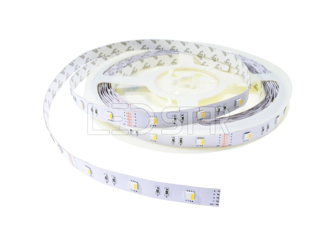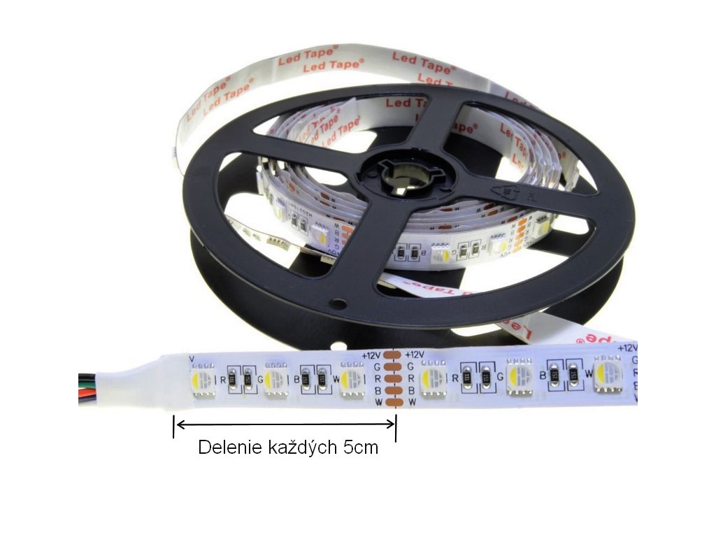 Profesionálny LED pásik RGBW + Samostatná Studená biela, 4 segmentové LED čipy s Bielou farbou v každom čipe, pri požiadavke na silný jas dosahuje vysoký výkon až 19.2W/m inak je ovládačom možné nastaviť úspornú spotrebu