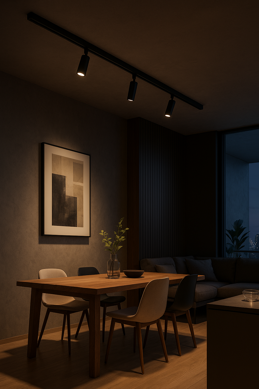 Obývacie priestory a chodby – diskrétne prechody medzi stenami a stropom, bez káblov navonok.