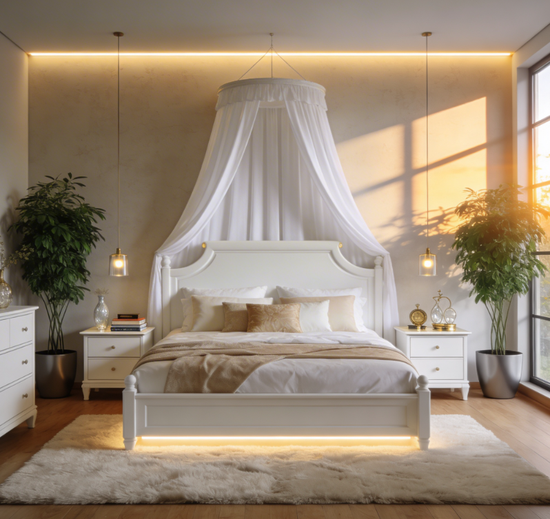 Osvetlenie v spálni kde sa uplatní teplá biela farba a jednoliaté svetlo pôsobí veľmi exkluzívne aj pri vysokých nárokoch