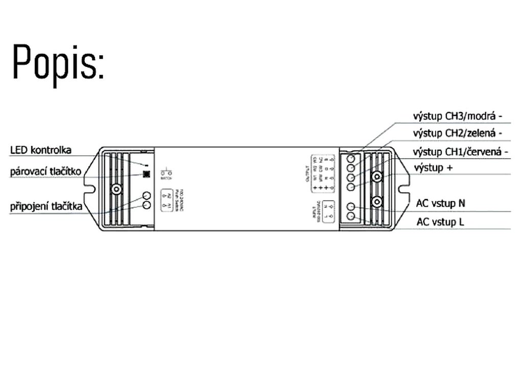 Max. povolené prúdové zaťaženie ovládača je 1A na 1 kanál, pri 3 kanáloch sú to teda 3A. Vo vyjadrení na watty to znamená max. 240W na jeden kanál, celkové povolené zaťaženie na všetky 3 kanály je max. 720W. Max. dlžka pripojeného pásu sa odporúča do 50m, pri väčšej dlžke treba podľa typu LED pásu či neónu overiť vznik interferencie.