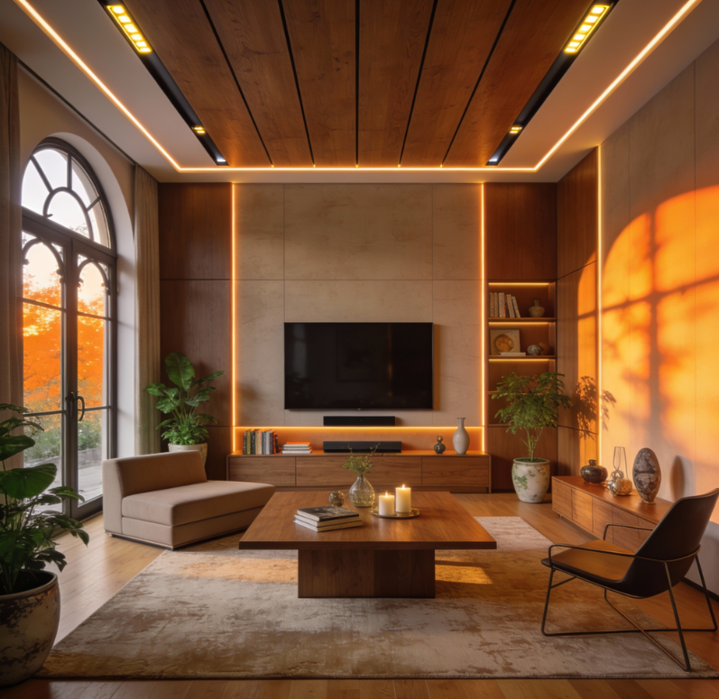 Nepriame osvetlenie obývačiek, spální a jedální v sadrokartónových podhľadoch, rampách a výklenkoch, kde teplá biela 3000K vytvára príjemnú atmosféru.