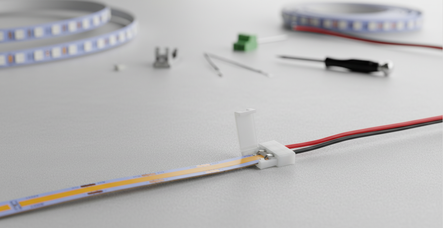 Rýchle napojenie kratších úsekov COB pásu pri montáži v sadrokartóne, lištách a hliníkových profiloch.