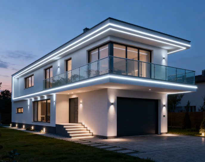 Napríklad jedno z častých využití je osvetlenie obrysov budov s umiestnením LED pásu po obvode :