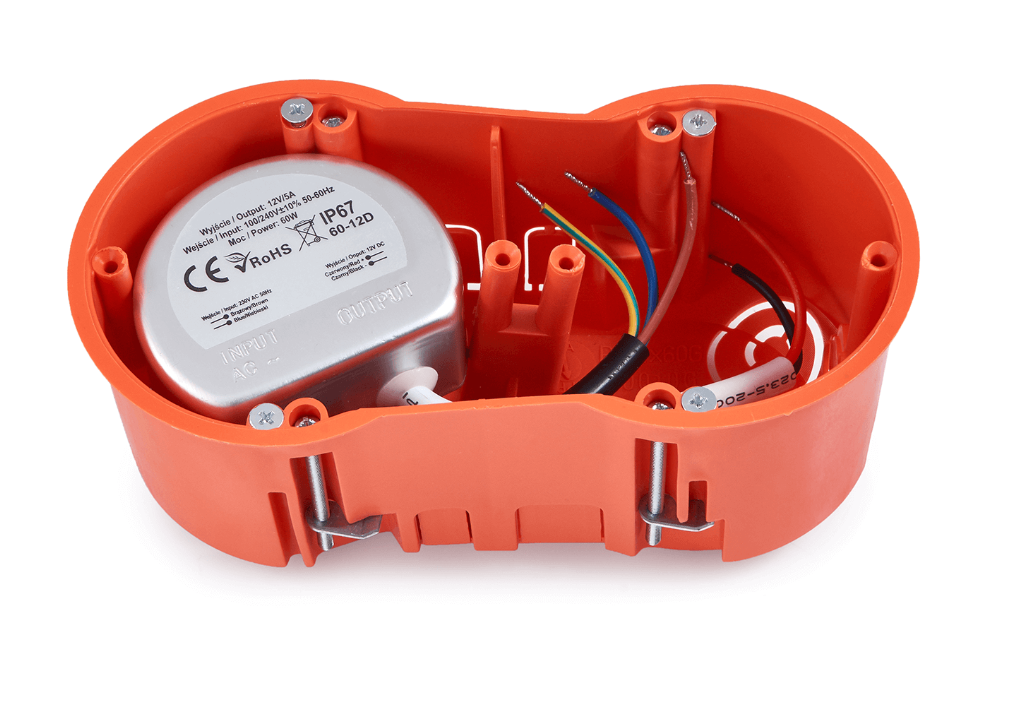 Inštalácia: Zdroj sa umiestňuje do elektroinštalačnej krabičky (Ø68mm) pod omietku, zapojenie podľa schémy na tele zdroja. Vďaka nízkej výške 23mm sa pohodlne zmestí do väčšiny krabičiek.