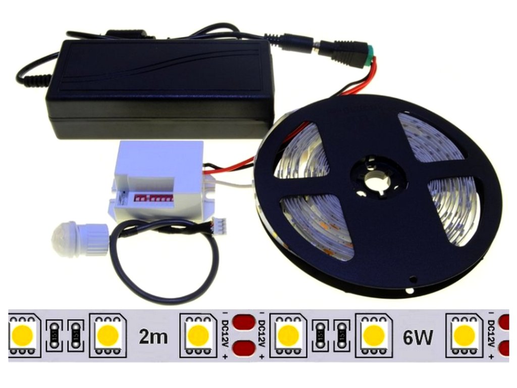Osvetlenie reagujúce na pohyb, kompletná sada s úsporným 6W modelom vhodným na nočné svietenie. Súčasťou je pohybový snímač s PIR senzorom, reaguje na pohyb a automaticky zapína LED pásik. Jeho automatické zhasnutie je možné nastaviť na rôzne časové intervaly.