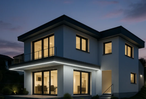 Fasádne línie domu, garážové vjazdy – elegantný a moderný svetelný efekt v noci