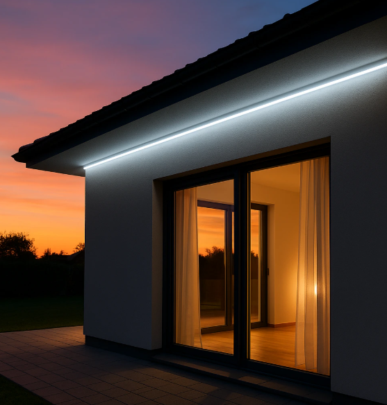 Moderné architektonické akcenty so studeným bielym svetlom – línie na budovách, pergolách, pod strechou.