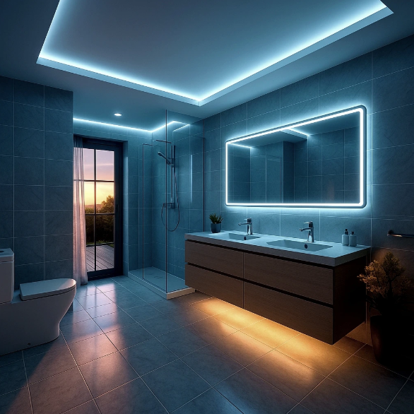 Kúpeľne v dome či byte - vode odolné prevedenie, aj veľké dĺžky do 50m v jednom kuse LED pásu - z dlhodobého 10ročného horizontu užívania je vhodné použitie na strope alebo tam kde sa neočakáva priamy kontakt s človekom