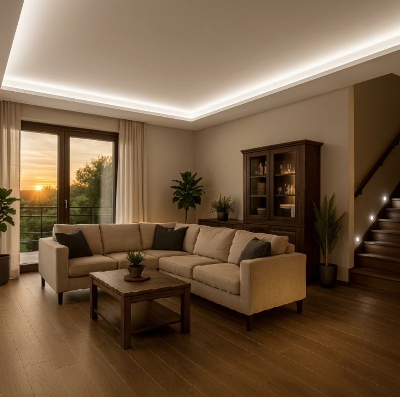 Osvetlenie znížených stropov – predovšetkým tam kde je LED pás vnorený pod rímsu alebo za sadrokartón, takže je vidieť iba odraz svetla, vtedy nevadí že nepoužijeme COB LED pás, ktorý preto že línia svetla bude pôsobiť súvislo a však s väčším jasom ako je tomu pri COB páse, pripomíname že môžeme použiť až 50 metrov LED pásu v jednom kuse s jeho pripojením na jednom konci na 230V napätie