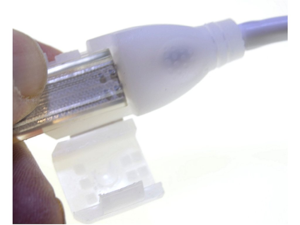 Pripojenie je rýchle a jednoduché – akýkoľvek dlhý LED pás zapojíte do 230V zástrčky pomocou Pripájacej šnúry s usmerňovačom. Ak neplánujte LED pás pripájať ku niektorému 230V stmievaču, budete potrebovať šnúru objednať. Model šnúry ktorý máme v ponuke pre tento LED pás, je vybavený KLIK mechanizmom pre veľmi jednoduché pripojenie: