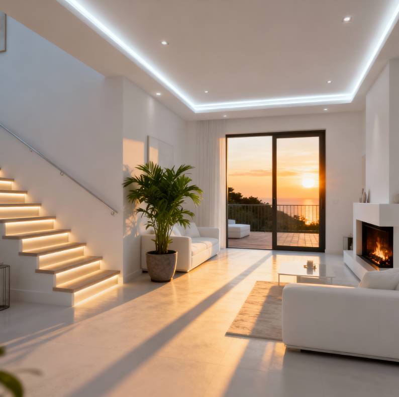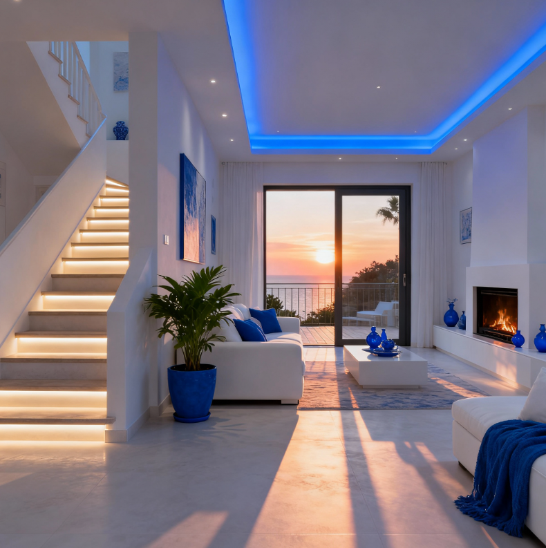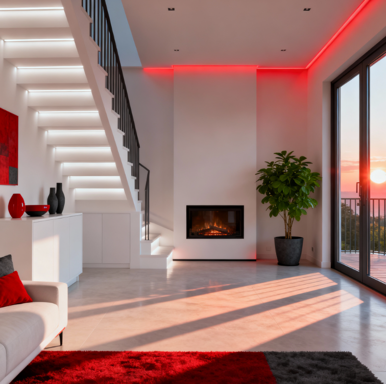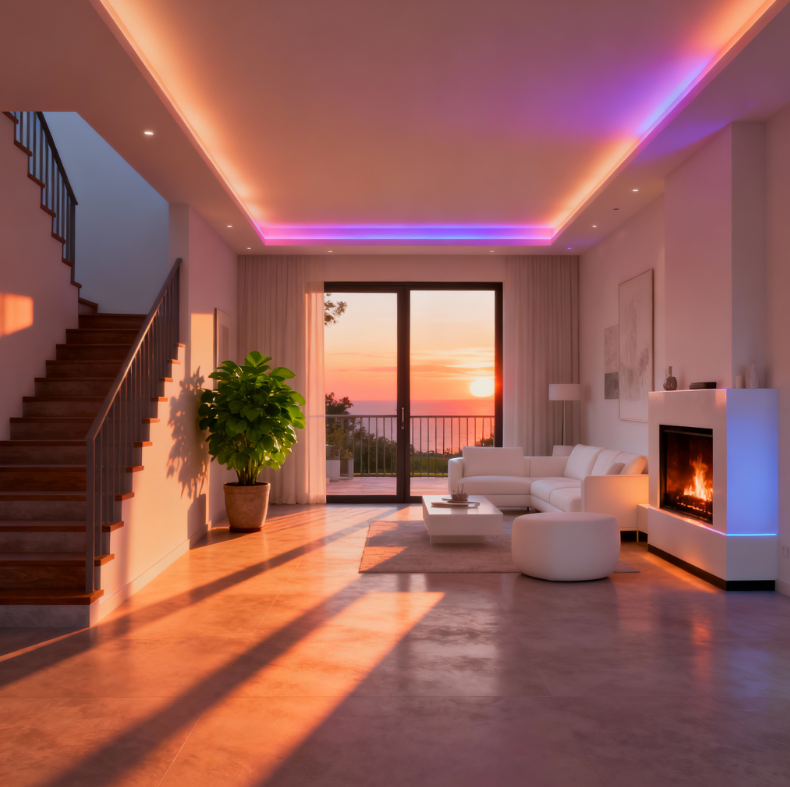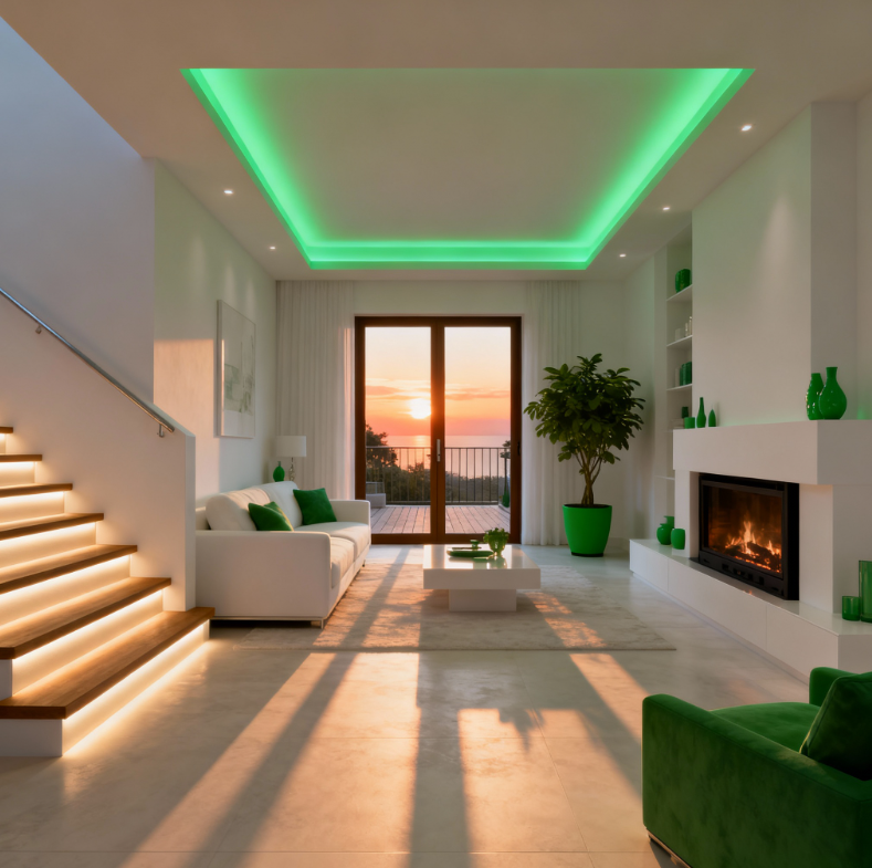 Dekoratívne a akcentové RGB osvetlenie v interiéri: podhľady, nábytok, výklenky, poličky, vitríny a dizajnové línie svetla bez bodov