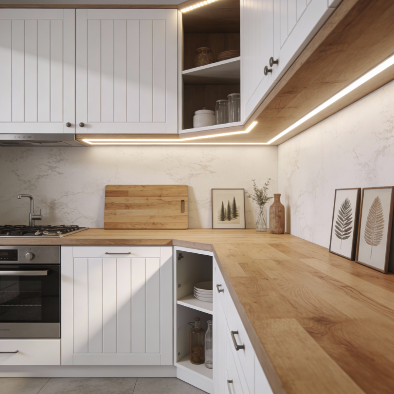 rohové prechody v kuchynských linkách, policiach a nábytkových zostavách,