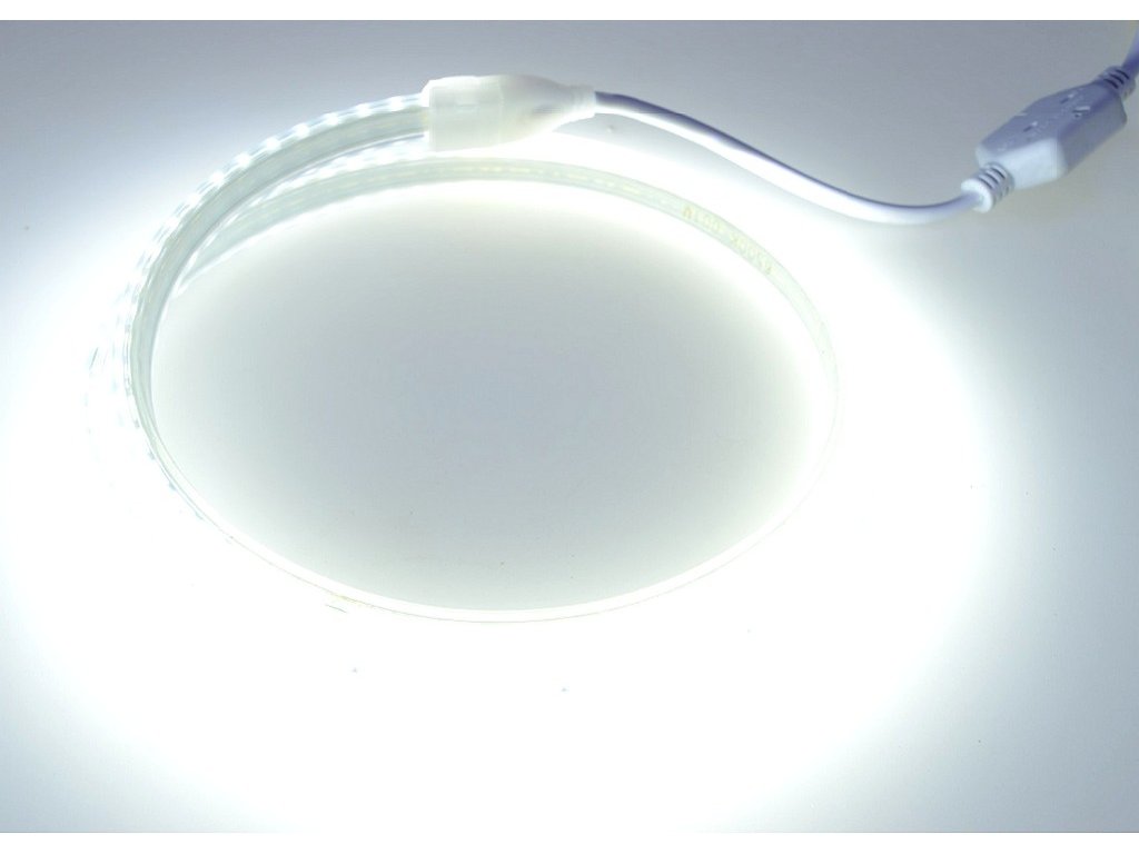 Vode odolný 230V flexibilný LED pás s mimoriadným studeným jasom s namodralou Studenou farbou svetla 6000-6500K, s mimoriadnou svietivosťou 2400lm/m - čo zodpovedá jasu cca 167W klasickej žiarovky ! Pritom pás má nízku 14W spotrebu, LED pás nepotrebuje napájací zdroj !