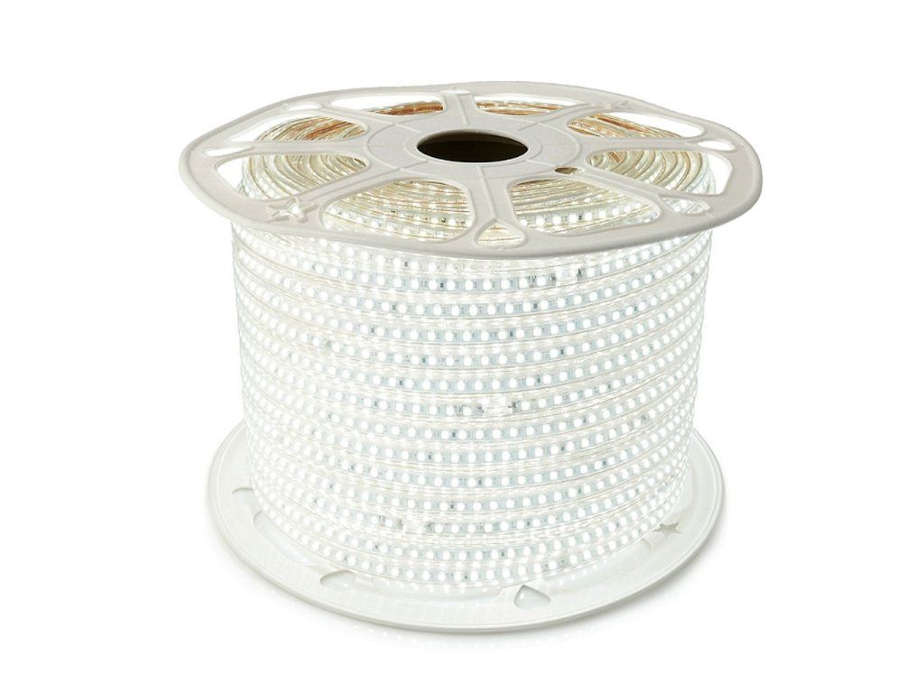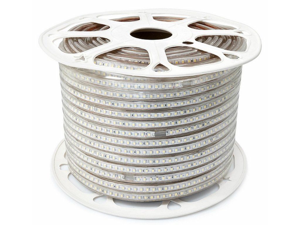 Vode odolný 230V flexibilný LED pás v robustnom odolnom puzdre, s jasnou Studenou bielou farbou svetla. Počet diód 120LED/m, vyššia hustota pre väčší výkon a vyššiu svietivosť. Alternatívny zdroj hlavného svetla v priestoroch objektov, ale aj vonku.