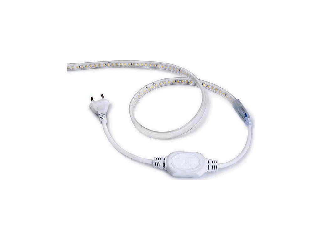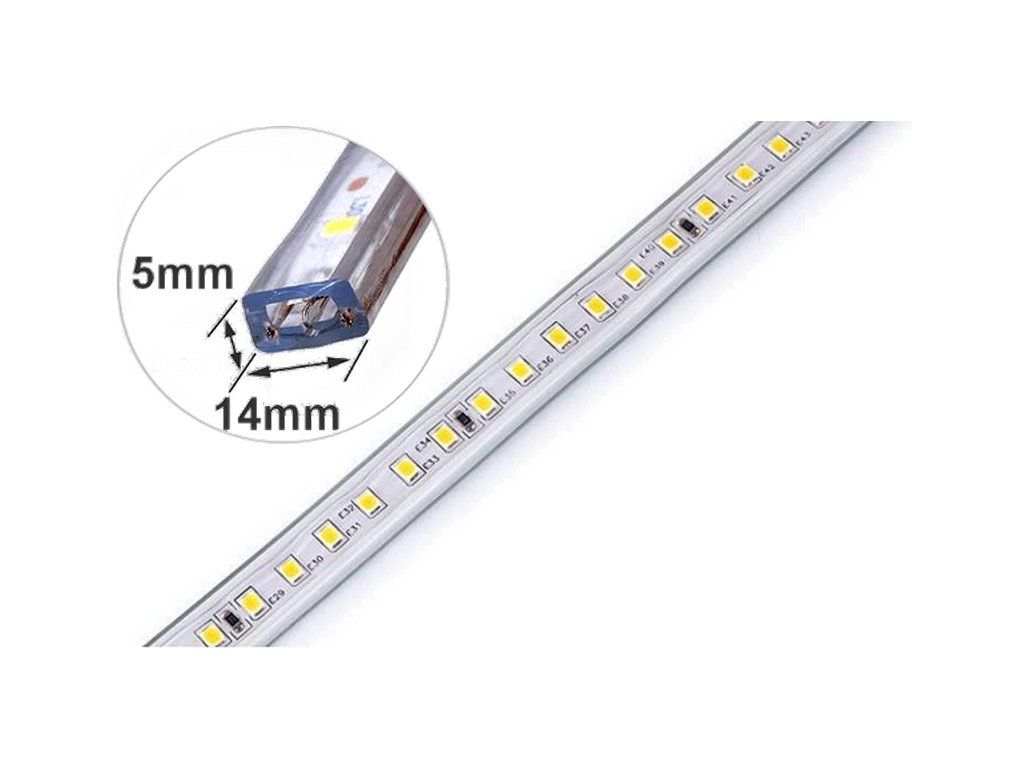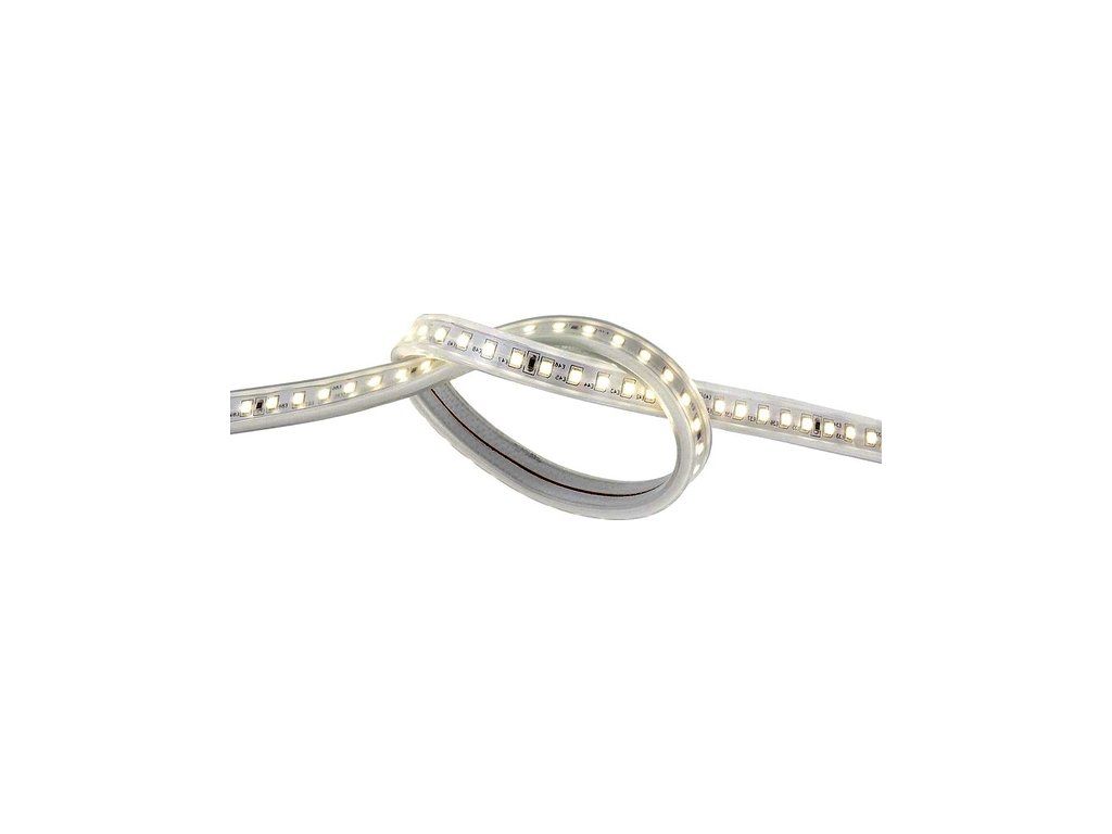 Vode odolný 230V flexibilný LED pás v robustnom odolnom puzdre, s jasnou Studenou bielou farbou svetla. Počet diód 120LED/m, vyššia hustota pre väčší výkon a vyššiu svietivosť. Alternatívny zdroj hlavného svetla v priestoroch objektov, ale aj vonku.