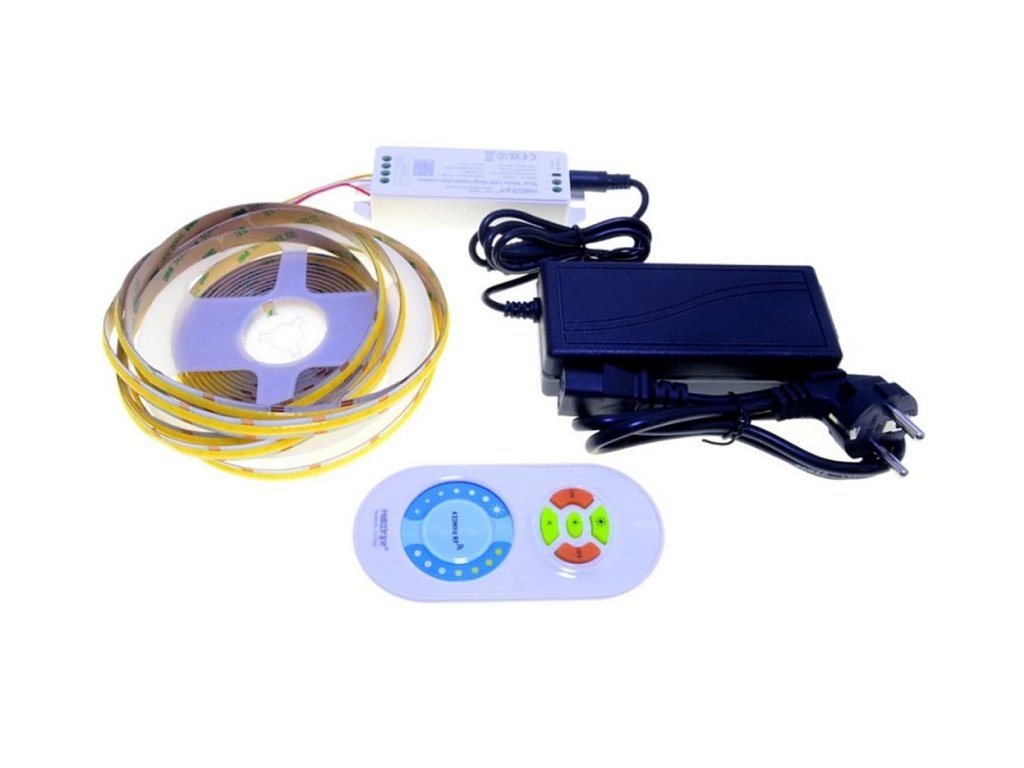 CCT Duálny COB LED pásik svietiaci súvislou bielou farbou od Teplej až po Studenú, v kompletnej sade s príslušenstvom. Komponenty sady: