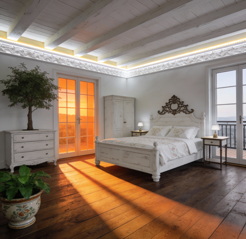 Lištu je možne prekryť ozdobnou lištou s ornamentami a pri použití vhodného LED pásika (napr. COB CCT alebo RGB) je možné meniť aj farbu svetla či odtieň bielej farby: