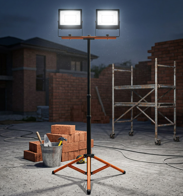 Dvojramenná konštrukcia umožňuje pripevniť dva reflektory (napr. 2× 50W alebo 2× 100W) na priečny nosník, ktorý sa dá otočiť a nakloniť pre optimálne rozloženie svetla. Nastaviteľná výška do 1,6 m a skladacie nohy robia stojan prenosným a rýchlo rozložiteľným na mieste práce – stačí ho postaviť, pripevniť reflektory a zapojiť kábel 230V. Robustná kovová trojnohá zaisťuje stabilitu aj pri väčších reflektoroch alebo na nerovnom povrchu.