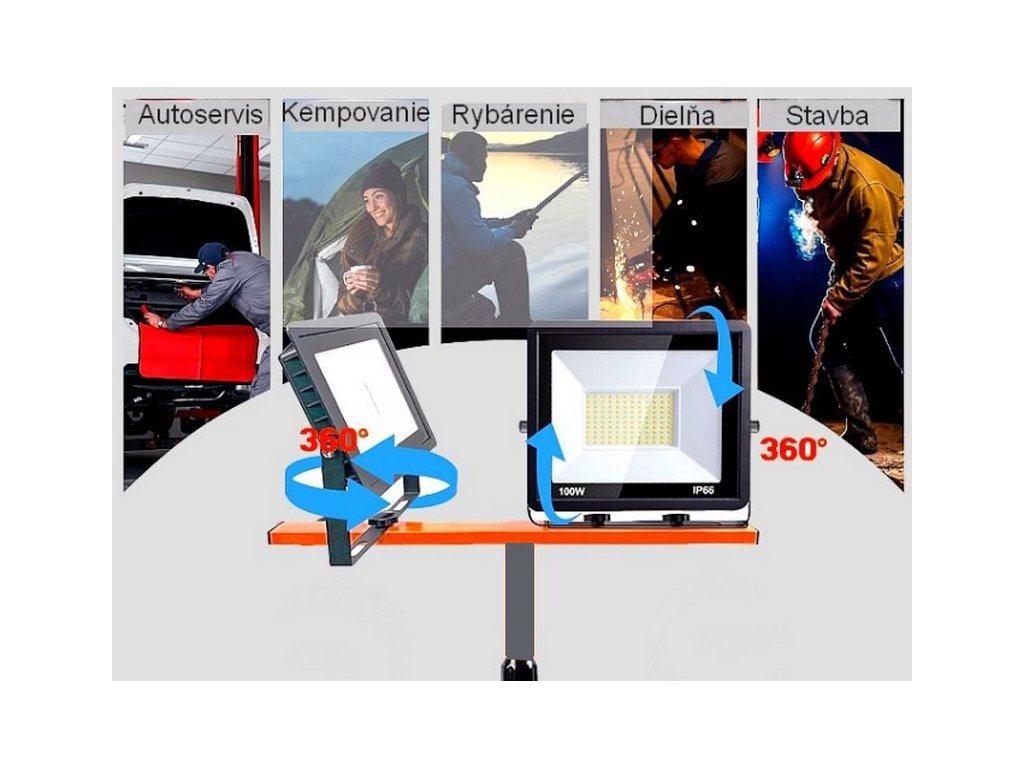 Dvojramenná konštrukcia umožňuje pripevniť dva reflektory (napr. 2× 50W alebo 2× 100W) na priečny nosník, ktorý sa dá otočiť a nakloniť pre optimálne rozloženie svetla. Nastaviteľná výška do 1,6 m a skladacie nohy robia stojan prenosným a rýchlo rozložiteľným na mieste práce – stačí ho postaviť, pripevniť reflektory a zapojiť kábel 230V. Robustná kovová trojnohá zaisťuje stabilitu aj pri väčších reflektoroch alebo na nerovnom povrchu.