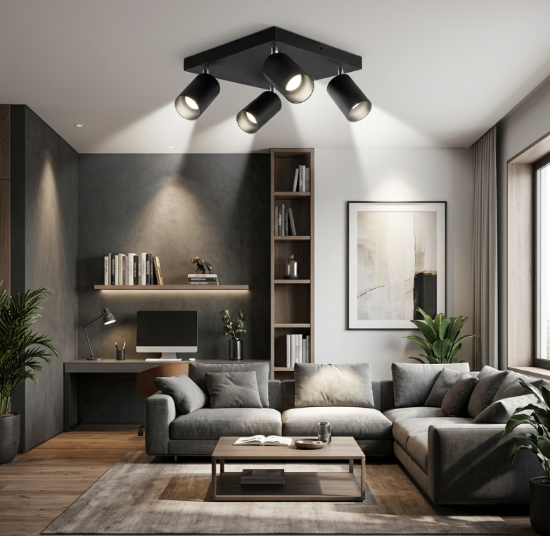 Telo svietidla je vyrobené z kombinácie hliníka a ocele, čo zaručuje pevnosť, odolnosť a dobré chladenie. Štyri valcové reflektory s priemerom približne 55 mm a výškou 80 mm sú umiestnené na štvorcovej základni 250×250 mm a dajú sa samostatne natáčať aj vyklápať. Každá hlavica ponúka horizontálny uhol otočenia okolo 350° a vertikálny náklon až 90°, takže vieš presne nasmerovať svetlo na sedačku, jedálenský stôl, kuchynskú linku alebo obraz na stene. Matné čierne prevedenie s chrómovanými spojmi pôsobí elegantne a perfektne ladí s interiérmi v štýle loft, industrial aj minimal.