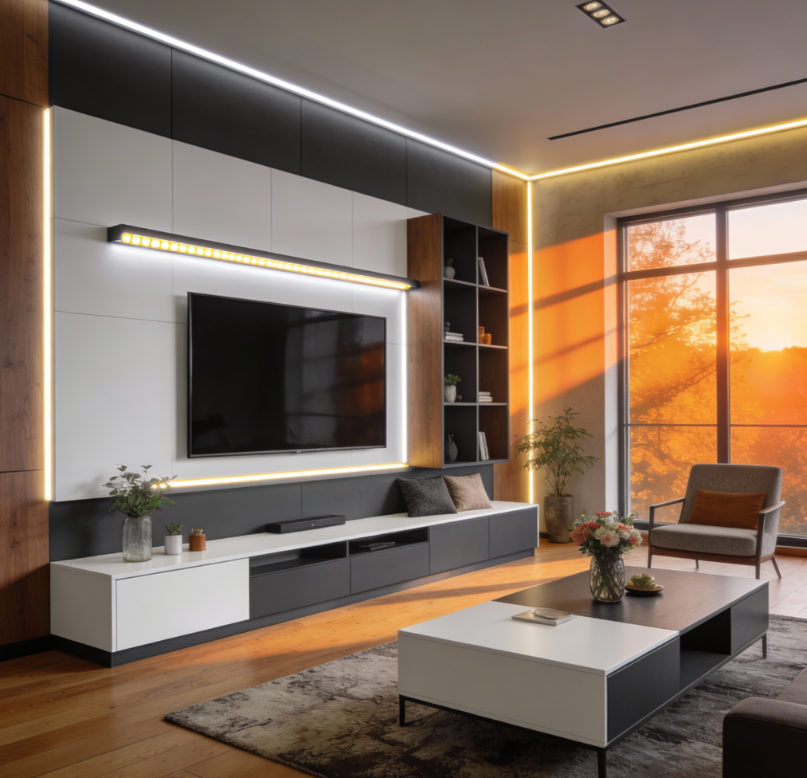 Nábytkové osvetlenie políc, vitrín, knižníc a TV stien v hliníkových profiloch s difúzorom, bez viditeľných bodov.