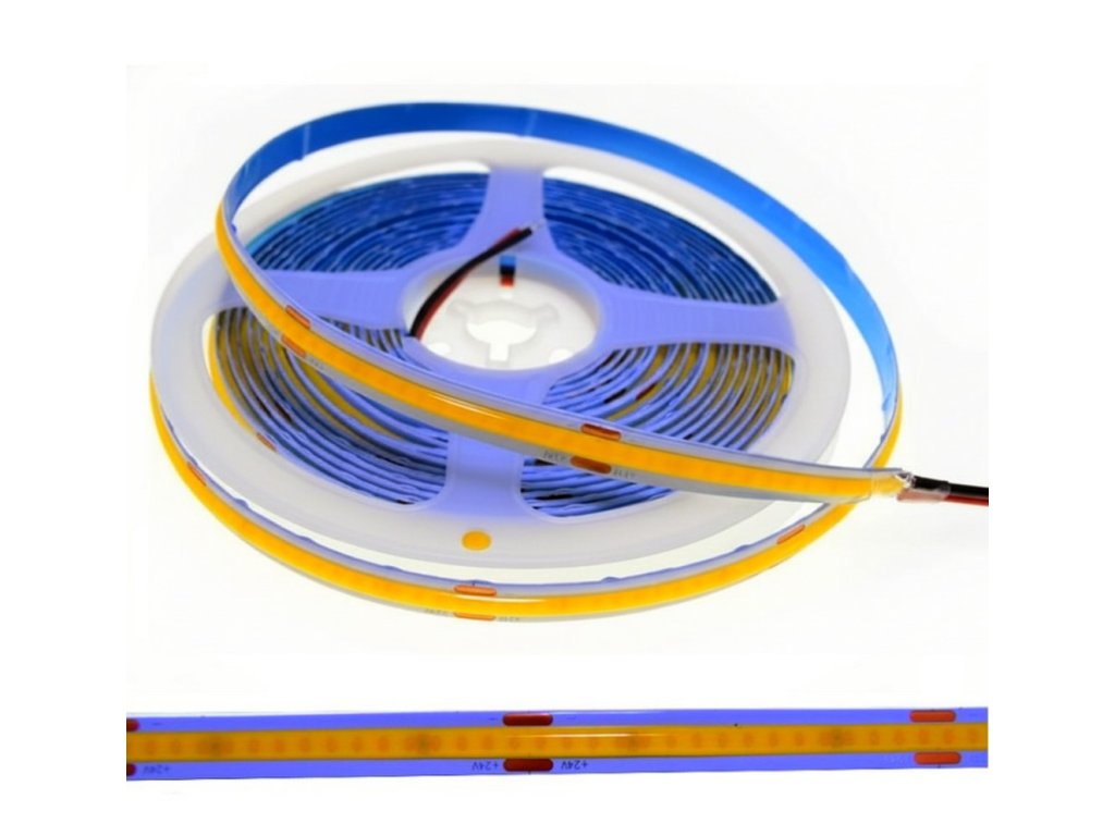 MasterLED COB LED pásik 5m Premium 24V 3000K Teplá biela 10W/m 320LED/m IP20 patrí medzi moderné pásiky s čipmi v luminofóre, ktoré vytvárajú neprerušovanú líniu svetla a eliminujú typický „bodkový“ efekt klasických SMD pásov.