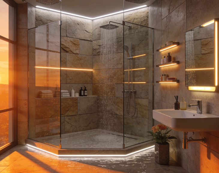 Kúpeľne, sprchové niky a zrkadlá osvetlené súvislou líniou neutrálneho svetla 4000K pre maximálny komfort.