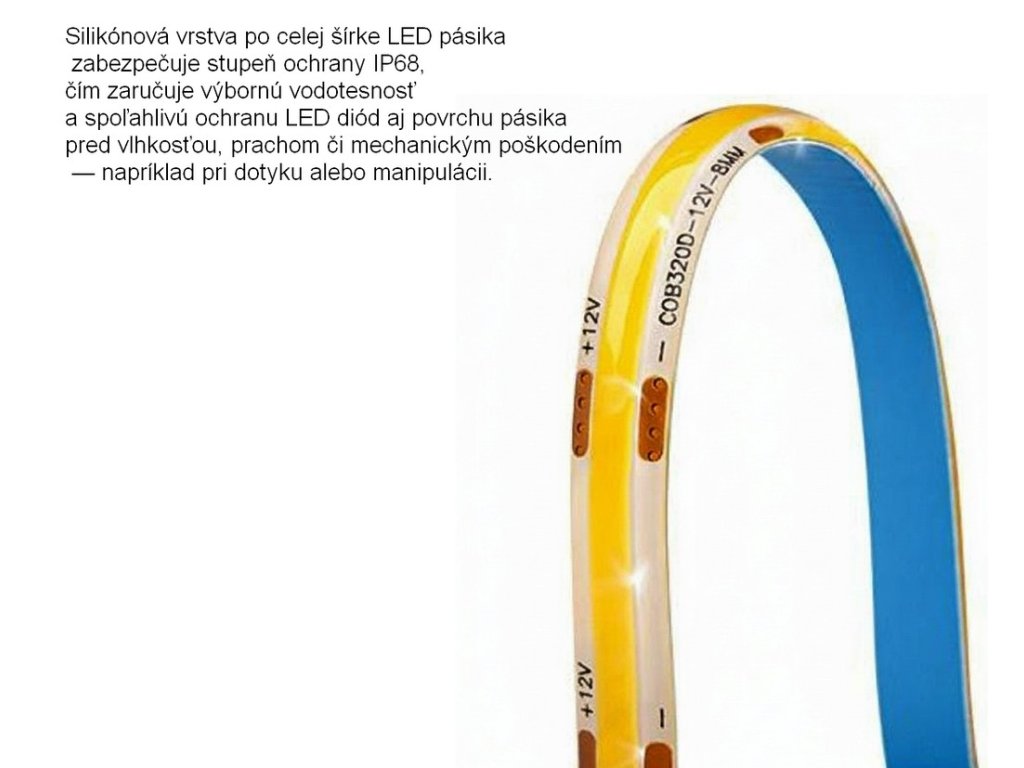 COB technológia s 320 LED/m zabezpečuje dokonale súvislú svetelnú líniu a vysoký svetelný výkon 800 lm/m pri príkone 10W/m.
