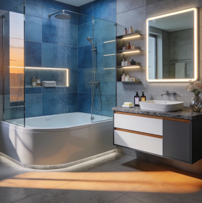 Kúpeľňové zrkadlá, sprchové niky a police, kde neutrálne svetlo zvýrazní štruktúru obkladov a IP65 zabezpečí bezpečnú prevádzku.