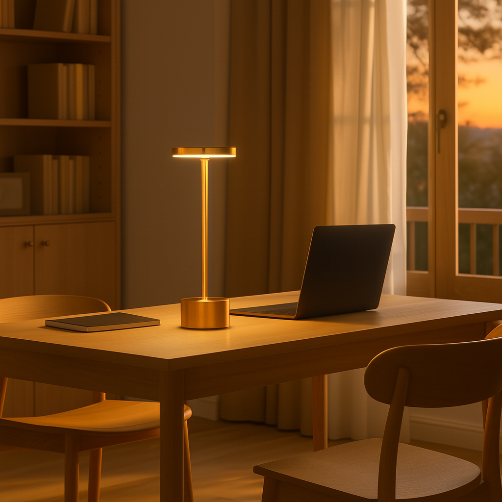 Dotyková LED stolná lampička Ritta v elegantnej zlatej farbe spája štýlový dizajn s praktickými funkciami. Vďaka trojstupňovému stmievaču si ľahko nastavíte intenzitu svetla – od jemného nočného osvetlenia až po plný jas vhodný na čítanie alebo prácu.