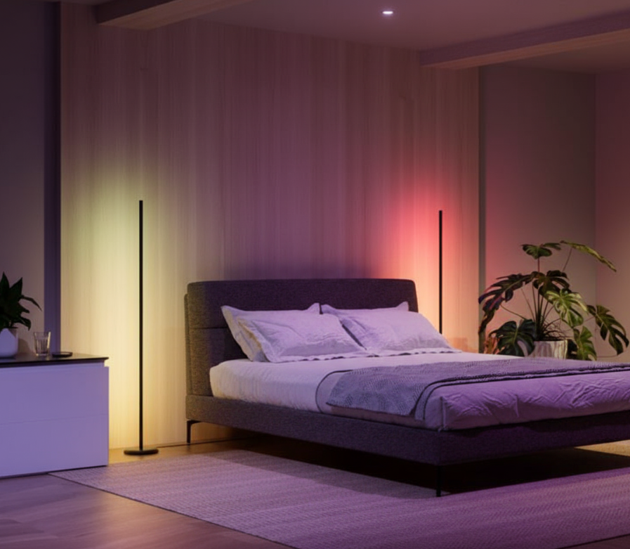 Moderná rohová LED lampa so stojanom, určená na osvetlenie rohov, stien alebo podčiarknutie atmosféry v obývačke, spálni, herni alebo pracovni. Lampa využíva 81 LED SMD 5050 RGB + 81 LED SMD 2835 biela CCT diódy – výber farieb a teploty bielej prostredníctvom priloženého diaľkového ovládača. LED pásik je umiestnený v úzkom profile z hliníka/plastu, výsledkom je rovnomerné rozptýlené svetlo s vysokou účinnosťou či už na efektné svietenie alebo nepriame ambientné svetlo.