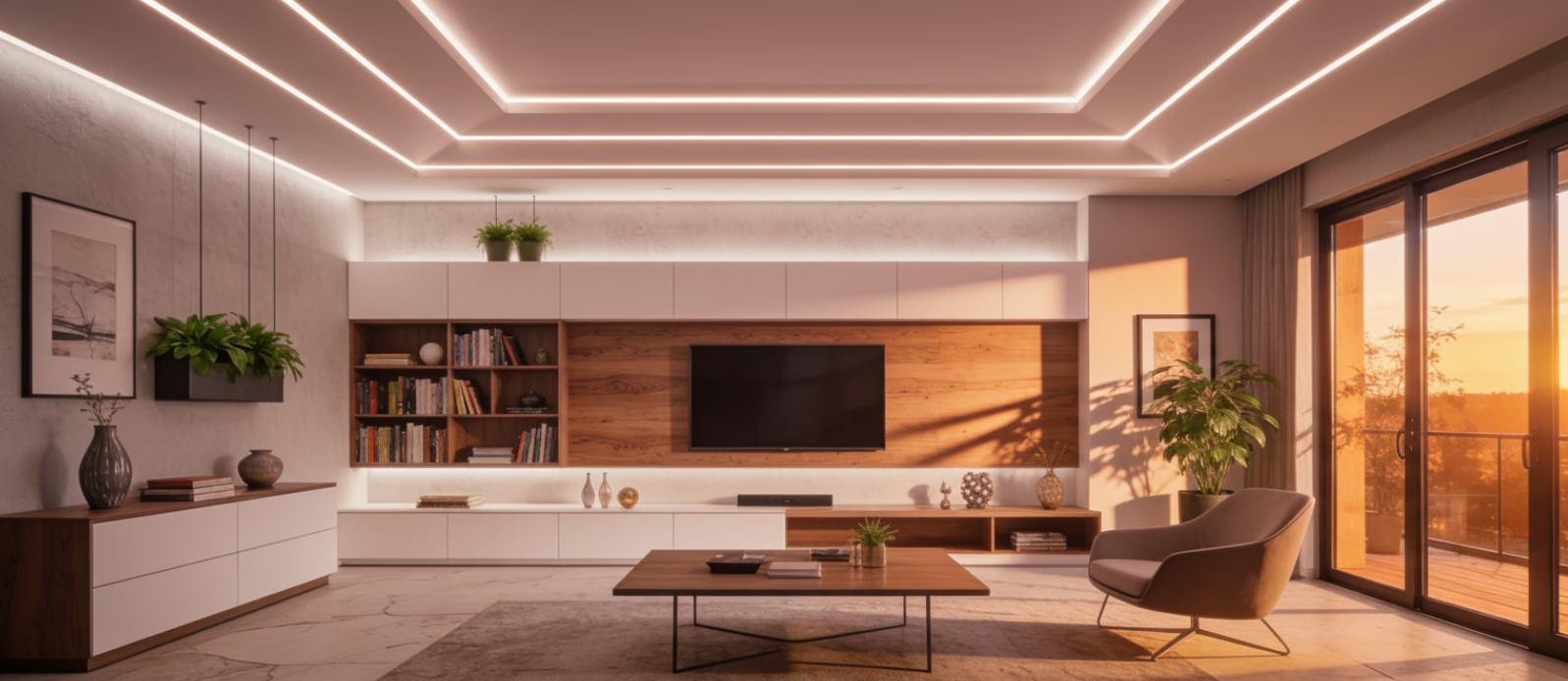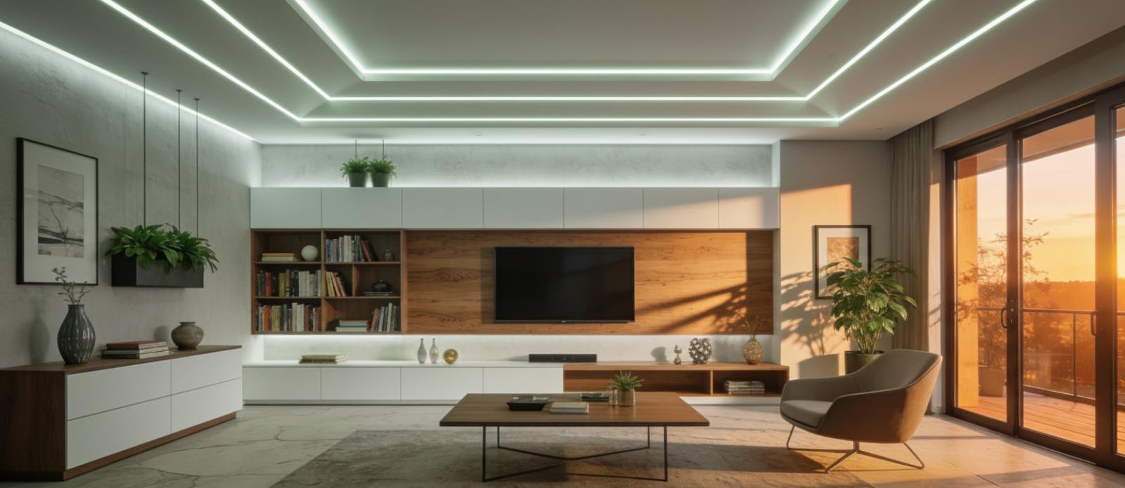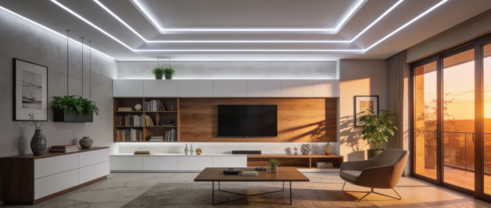 Dekoratívne línie v podhľadoch, rímsach, nikách a štrbinách – kombinácia farebného a bieleho svetla pre rôzne atmosféry.