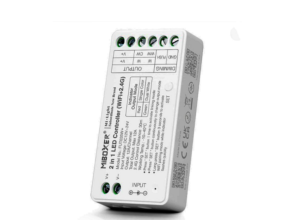 WiFi Stmievač pre Duálne CCT a jednofarebné Bielo svietiace LED pásiky alebo svetlá, v slim prevedení. Stmievač sa predáva samostatne, bez Diaľkového Ovládania. K stmievaču si môžete vybrať ktorýkoľvek model DO od výrobcu MiLight alebo MiBoxer. Jednému DO je možné priradiť viac týchto WiFi stmievačov. Tiež jeden stmievač môžete ovládať viacerými DO.