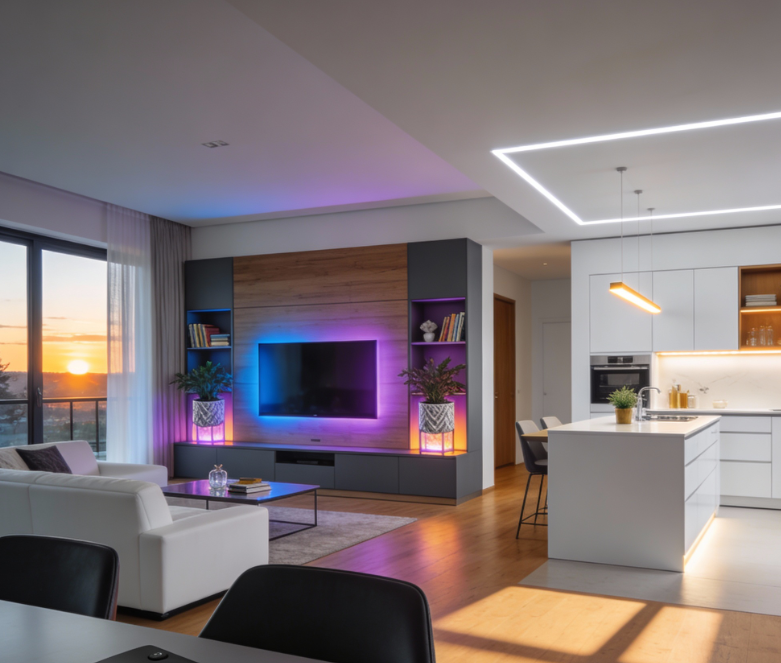 Riadenie RGB+CCT LED pásikov v celom dome: kuchyňa, obývačka, jedáleň, spálne, chodby, schodisko a kúpeľne (cez vhodné IP kontroléry).