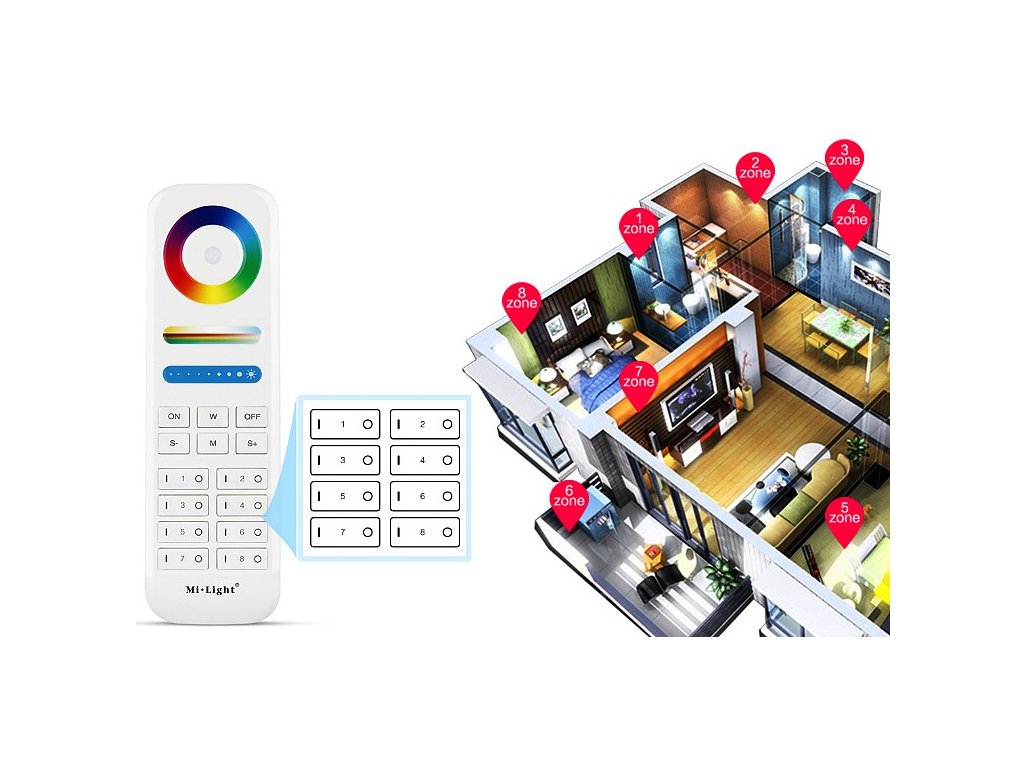 8 zónové ovládanie pre ovládanie až 8 samostatných okruhov s LED pásikmi resp. akýmkoľvek LED osvetlením od MiLight alebo MiBoxer