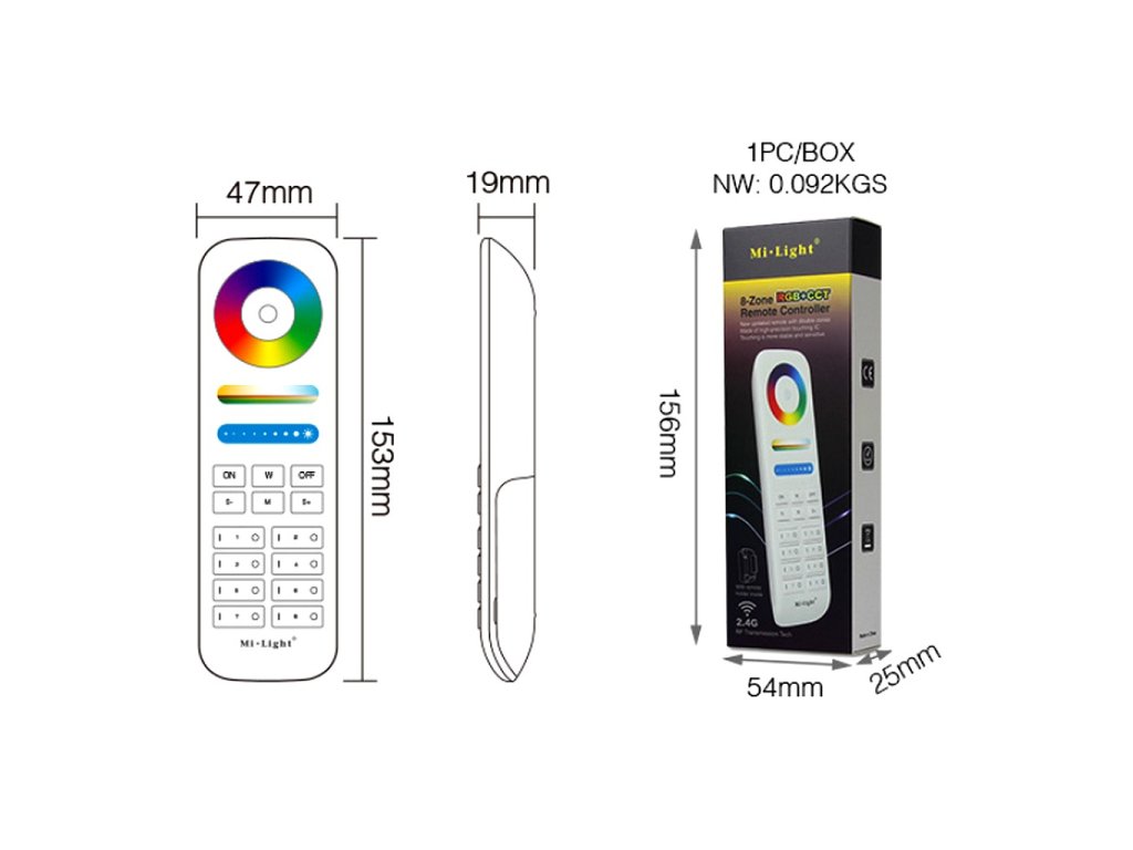 Ovládač FUT089B pracuje v bezdrôtovom pásme 2,4 GHz RF a je kompatibilný s RGB+CCT kontrolérmi a svietidlami MiBoxer/MiLight, čo umožňuje centrálne ovládanie celého systému inteligentného osvetlenia. Na čele má dotykové farebné koliesko na výber RGB odtieňov, samostatné tlačidlá pre zmenu teploty bielej, jasu, nasýtenia a množstvo funkčných tlačidiel pre jednotlivé zóny a scény.