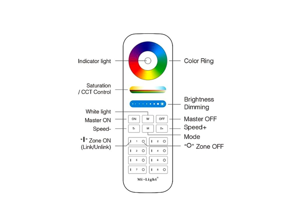 Ovládač FUT089B pracuje v bezdrôtovom pásme 2,4 GHz RF a je kompatibilný s RGB+CCT kontrolérmi a svietidlami MiBoxer/MiLight, čo umožňuje centrálne ovládanie celého systému inteligentného osvetlenia. Na čele má dotykové farebné koliesko na výber RGB odtieňov, samostatné tlačidlá pre zmenu teploty bielej, jasu, nasýtenia a množstvo funkčných tlačidiel pre jednotlivé zóny a scény.