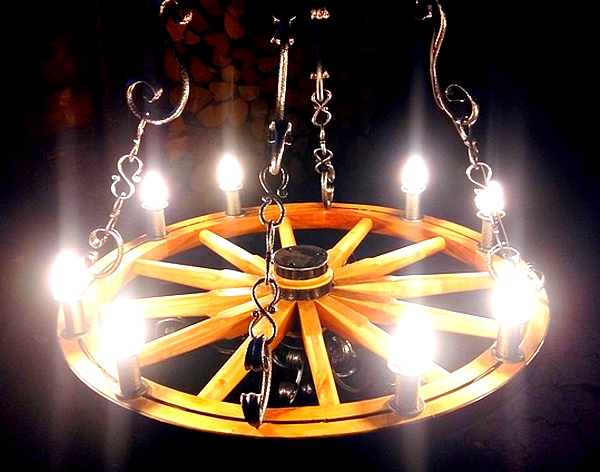 Na našej ukážke je vozové koleso nové, urobené na mieru majstrom kolesárom. Je z tvrdého jaseňového dreva. Kovanie k lustru sme si nechali vyhotoviť na mieru podľa nášho návrhu. My sme našli umeleckého kováča, ktorý s tým nemal žiadny problém. Zvládol aj okovanie kolesa obručou. Ak však máte menšie nároky, jednotlivé kovové komponenty lustra si môžete zakúpiť v predajani ozdobných prvkov ku kovovým plotom.