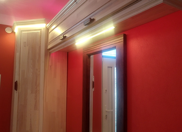 podsvietenie hornej rímsy vstavaného šatníka v chodbe, kde COB pásik vytvára jemný, rovnomerný svetelný efekt,