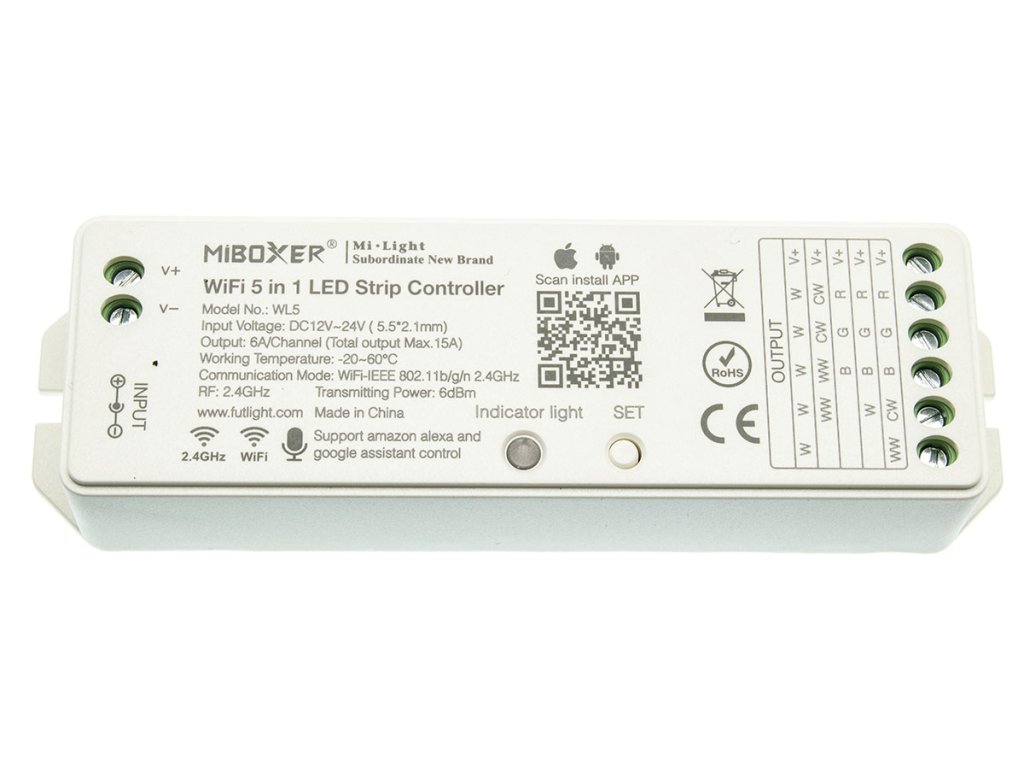 Multi univerzálny ovládač WL5 od MiLight, zároveň slúži aj ako WiFi, pre všetky typy LED pásikov : RGB, RGBW, RGB+Duálne, RGB CCT, Mono jednofarebné LED pásiky alebo svetlá, určený pre použitie s ovládačmi od MiLight alebo MiBoxer