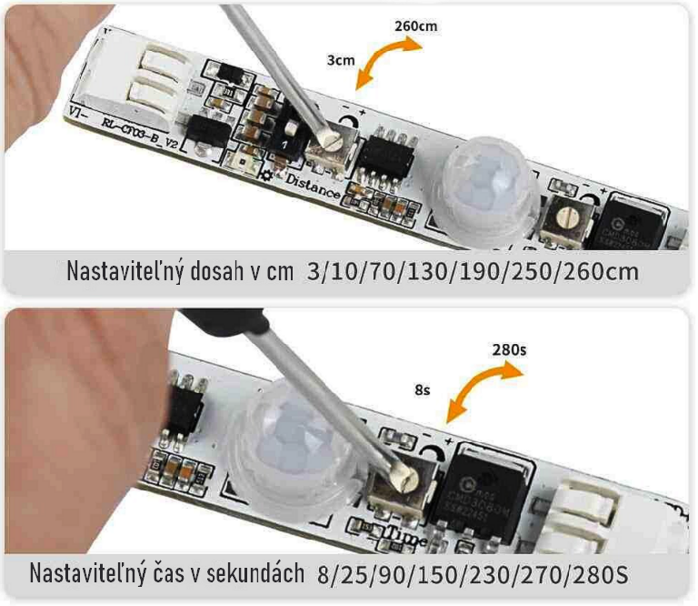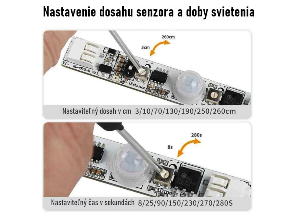 Pripoj vstupné vodiče zo zdroja 12–24 V DC a výstupné vodiče k LED pásiku podľa polarity na svorkovnici; následne nastav čas dobehu a dosah podľa potreby.