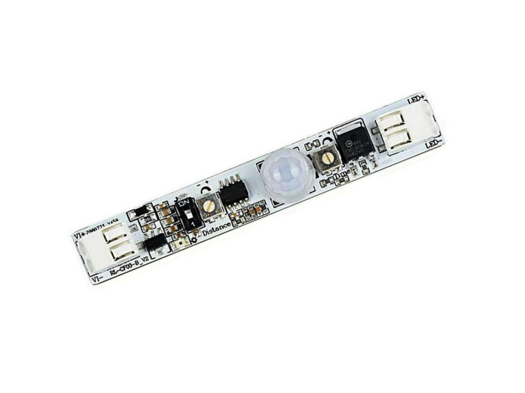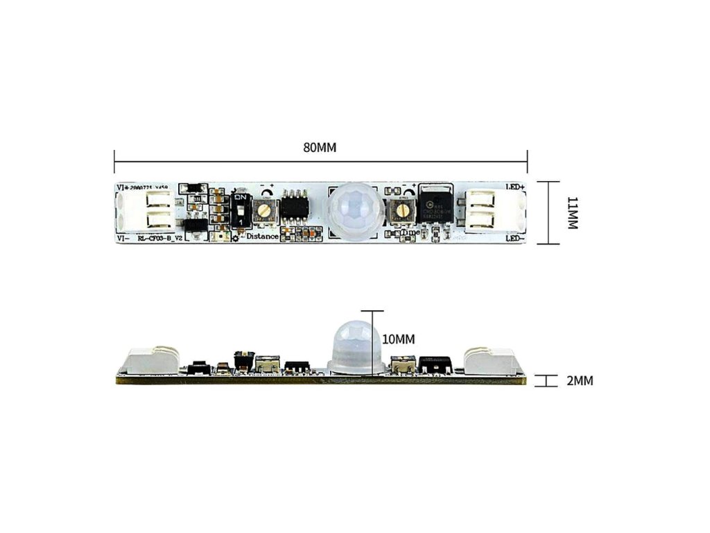 Typickým použitím je automatické ovládanie LED pásikov v skrinkách, šatníkoch, zásuvkách alebo pod kuchynskými skrinkami – svetlo sa zapne pri otvorení alebo priblížení ruky a po nastavenom čase sa vypne. Pripojovacie svorky umožňujú jednoduché zapojenie vstupu (napájací zdroj 12–24 V) a výstupu (LED pásik/LED modul) bez nutnosti spájkovania vodičov.